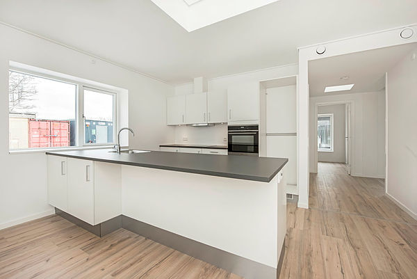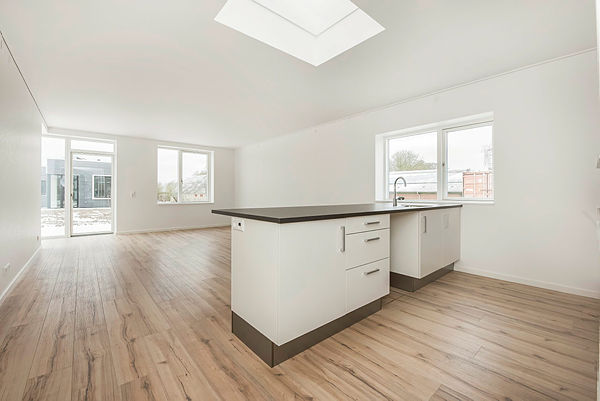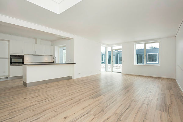 Boligerne er bygget med fladt tag, hvori der er etableret ovenlys som bringer lyset dybt ind i boligerne.